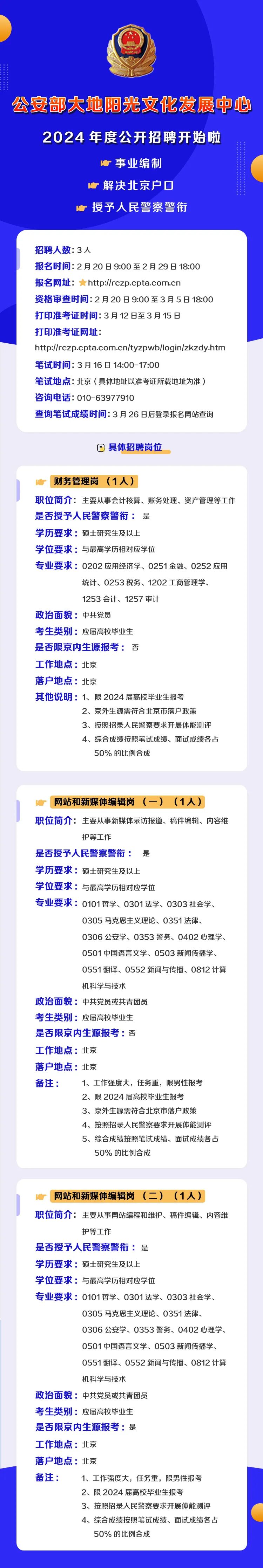 根据《人民警察法》《关于加强公安机关人民警察招录工作的意见》以及事业单位人事管理和公开招聘有关政策规定,结合工作需要,经人事主管部门审核同意,现将公安部大地阳光文化发展中心(以下简称“中心”)2024年度公开招聘有关事项公告如下:
