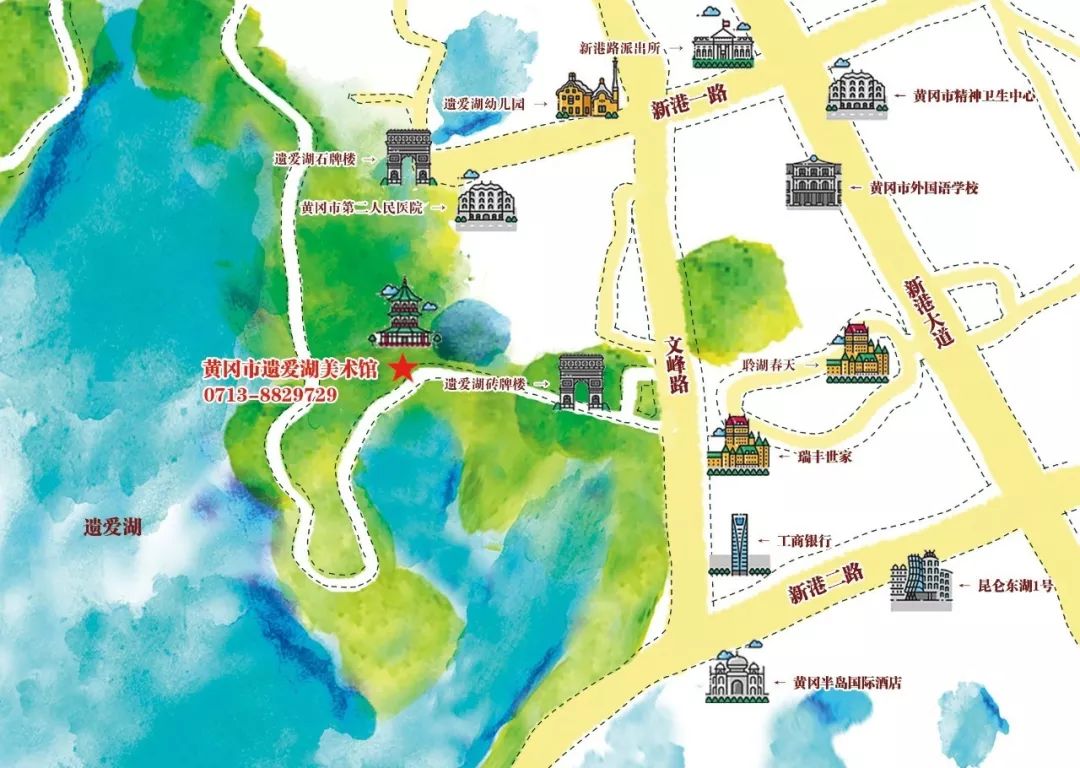 黄冈市遗爱湖美术馆位于遗爱湖风景区一蓑烟雨景区芸香阁内。驾车路线可导航至瑞丰世家,从红梅傲雪景区穿越即到。