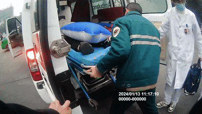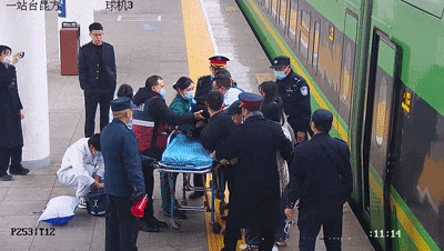 11时11分,D275次列车到达眉山站。站车工作人员协助医护人员将旅客送上救护车,前往眉山市人民医院接受治疗。