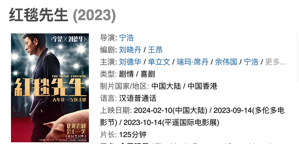 11月8日,由宁浩执导、刘德华领衔主演的优雅喜剧电影《红毯先生》宣布改档至2024大年初一(2月10日)上映,成为第一部正式定档2024年大年初一的真人电影。影片顺带发布了“大年初一见”特别视频。视频中宁浩和刘德华电话连线,两人化用片中的“资方梗”,用“优雅”的姿态将影片荒诞现实的气质贯彻到底。