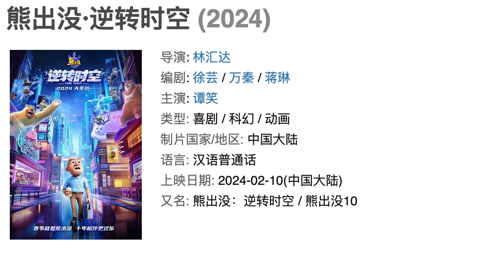 12月27日,电影《熊出没·逆转时空》发布定档预告和海报,正式定档2024大年初一。作为《熊出没》电影十年之作,《熊出没·逆转时空》不但延续了欢乐搞笑的“合家欢”风格,更将视听与特效质感再度升级。