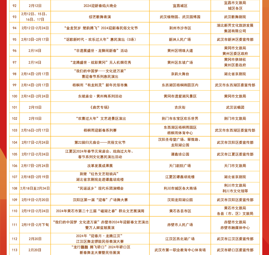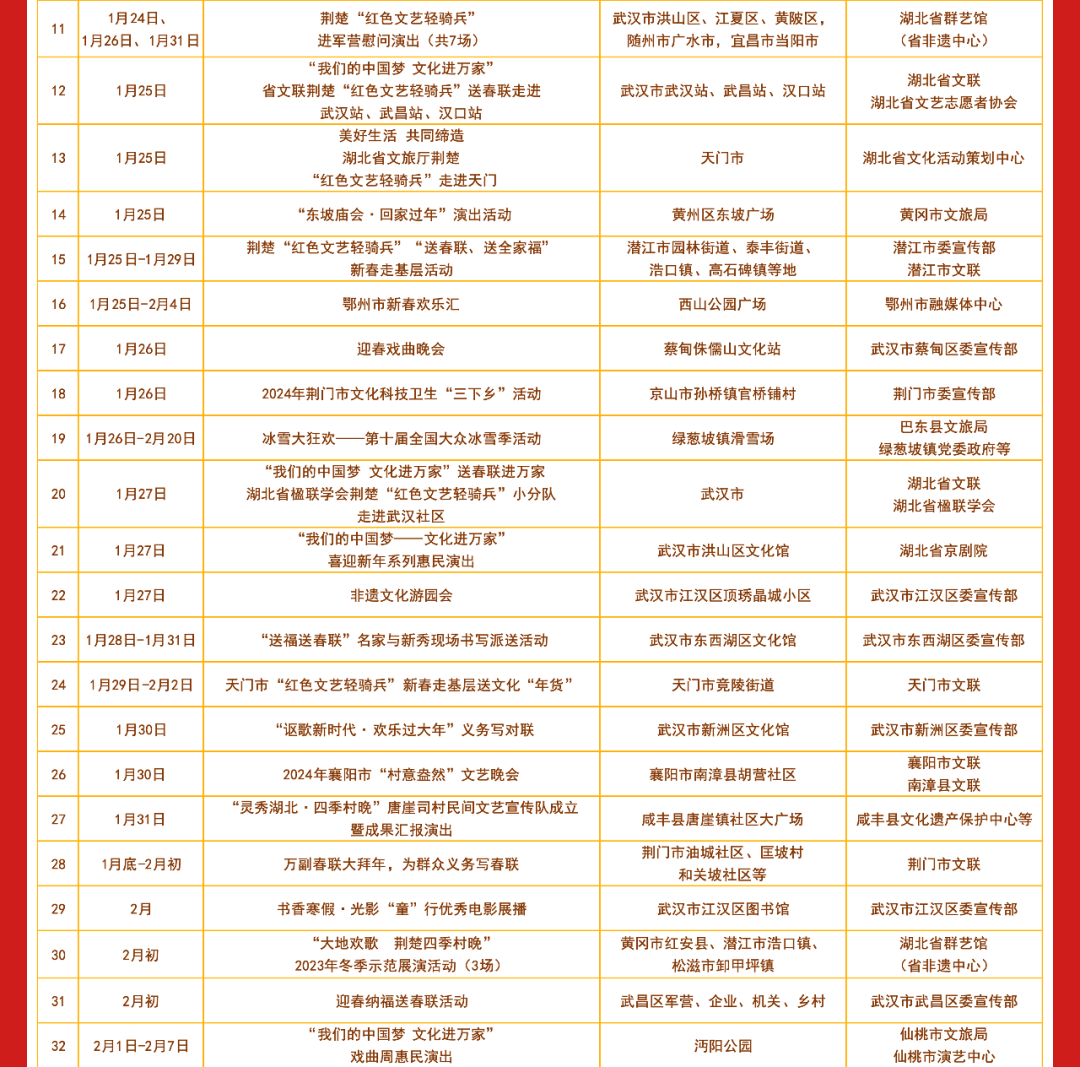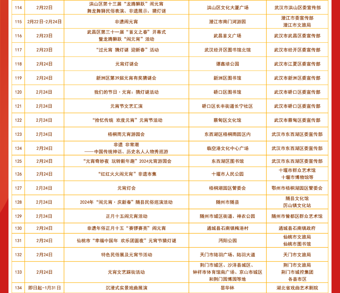 春节期间湖北各地将举办丰富多彩的文艺文化活动共分为惠民活动类 剧场演出类 展览展示类惠民活动都有哪些? 小布今天都为大家整理好了明天和后天 小布还将发布 剧场演出类、展览展示类 文艺文化活动汇总表 敬请期待! 来源:湖北发布