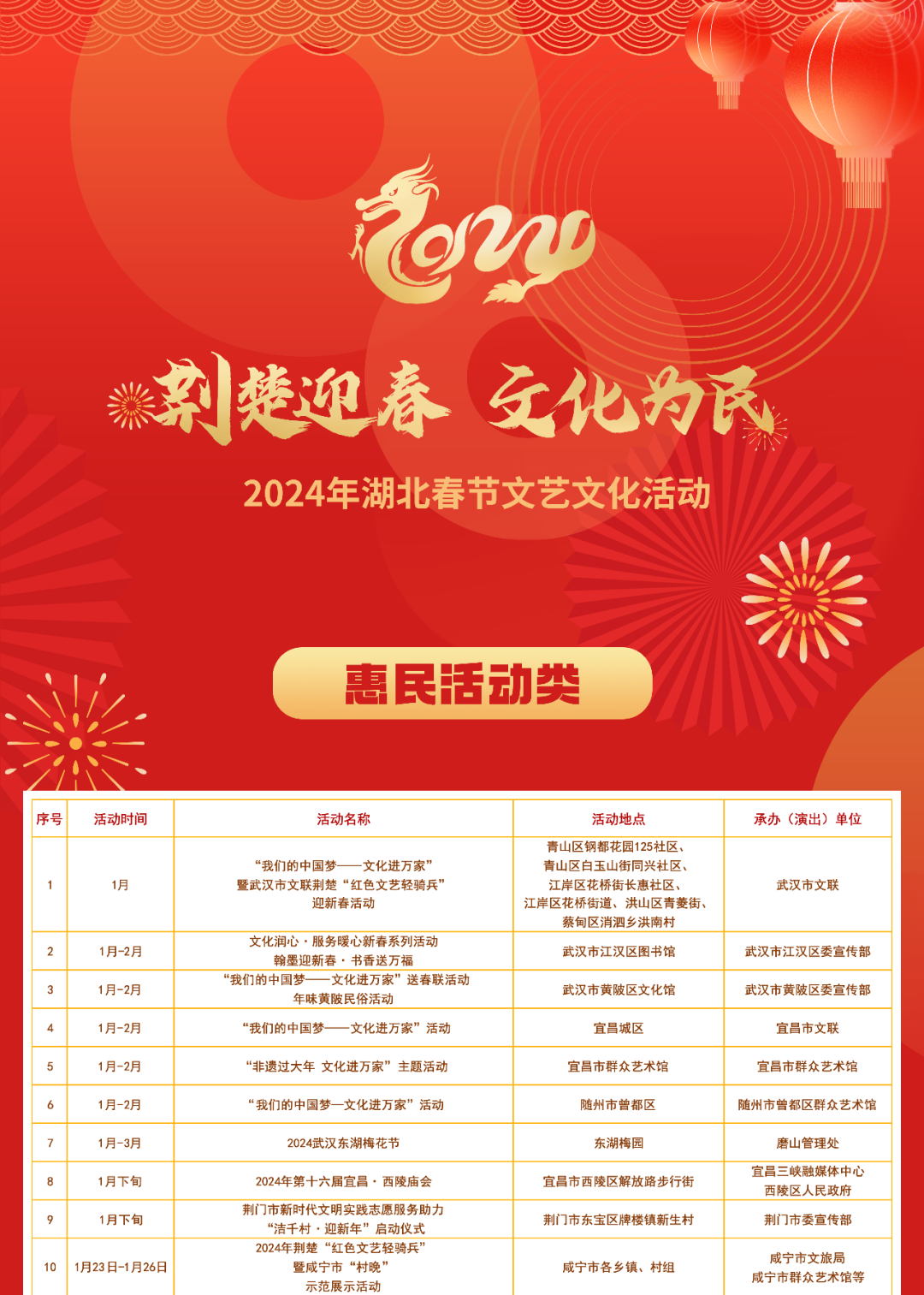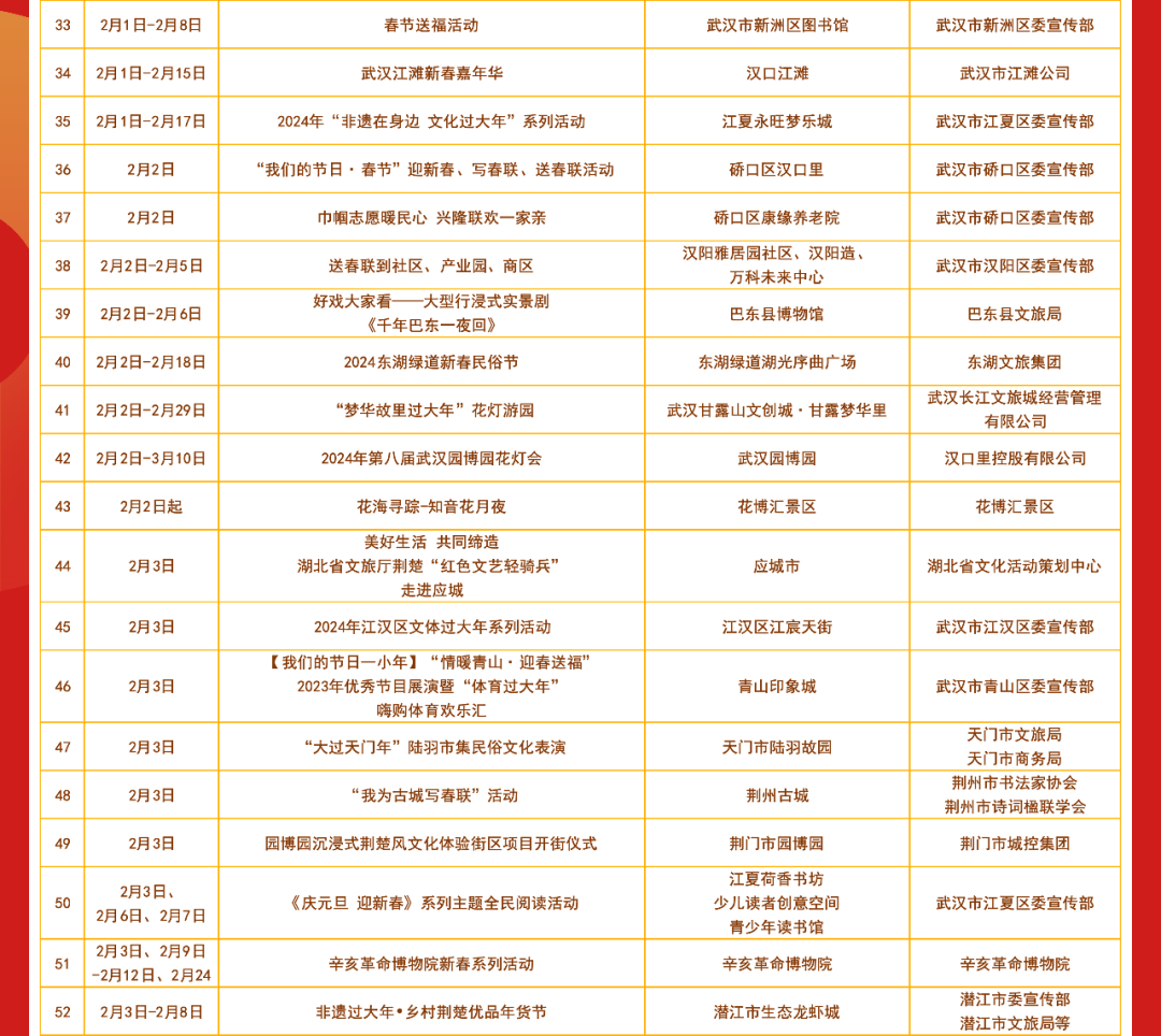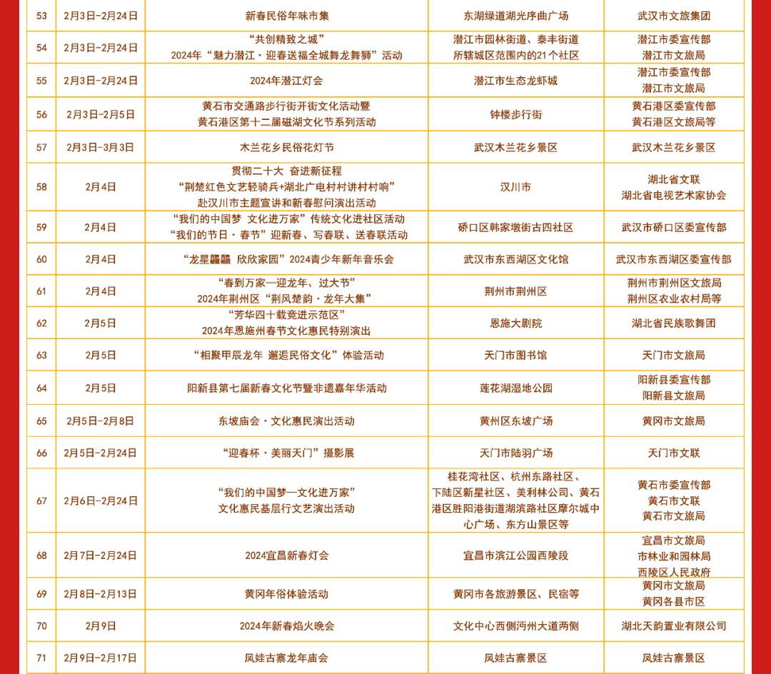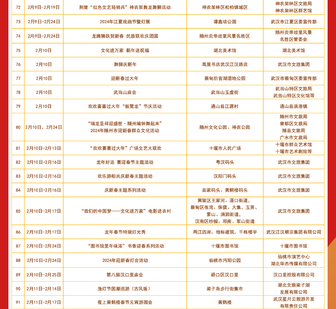 春节期间湖北各地将举办丰富多彩的文艺文化活动共分为惠民活动类 剧场演出类 展览展示类惠民活动都有哪些? 小布今天都为大家整理好了明天和后天 小布还将发布 剧场演出类、展览展示类 文艺文化活动汇总表 敬请期待! 来源:湖北发布