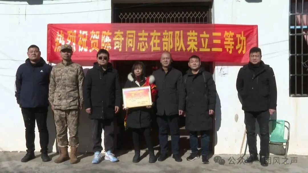日前,团风县退役军人事务局联合县人武部,为王毅、吴金涛、江亮、陈奇等13名荣立三等功的现役军人家庭送去立功喜报和慰问金。