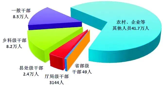 全国纪检监察机关处分人员按职级划分图通报显示,2023年,全国纪检监察机关共接收信访举报345.2万件次,其中检举控告类信访举报105.7万件次。处置问题线索173.3万件,其中谈话函询36.3万件。立案62.6万件,其中立案中管干部87人、厅局级干部3456人、县处级干部2.7万人、乡科级干部8.9万人;立案现任或原任村党支部书记、村委会主任6.1万人。处分61万人,其中党纪处分49.8万人、政务处分16.2万人;处分省部级干部49人,厅局级干部3144人,县处级干部2.4万人,乡科级干部8.2万人,一般干部8.5万人,农村、企业等其他人员41.7万人。