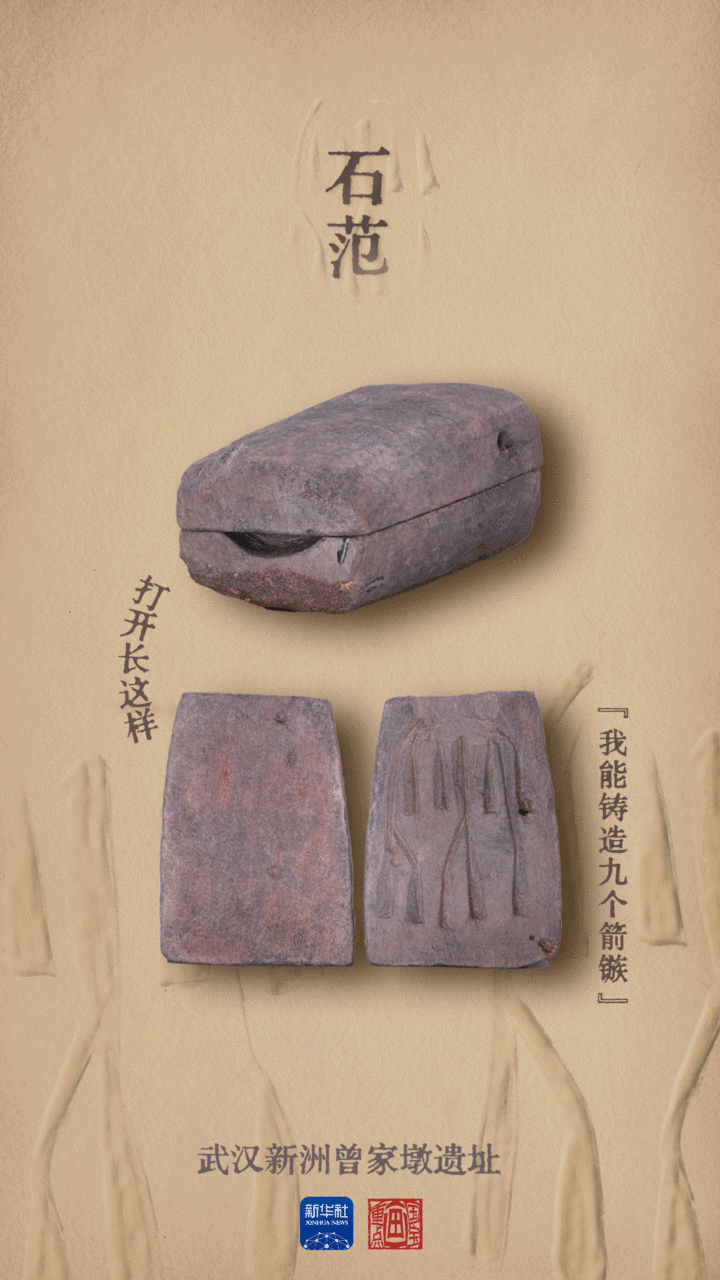 武汉新洲曾家墩遗址出土一块用于青铜箭镞铸造的石范,其形制规整、保存完好。“铜液从浇口灌注后,有多个通道分流,这个石范推测可以同时铸造9个箭镞”。武汉市文物考古研究所张剑说,这是武汉地区出土的保存最完整的青铜箭镞铸造石范。在西周遗址早、中、晚三期的地层内,分别都有青铜铸造遗物,如陶鼓风管、铜锭、铜渣、熔炉残壁等。对于研究中原王朝对南方的经营,特别是对南方铜料资源的控制和运输,具有重要学术价值。