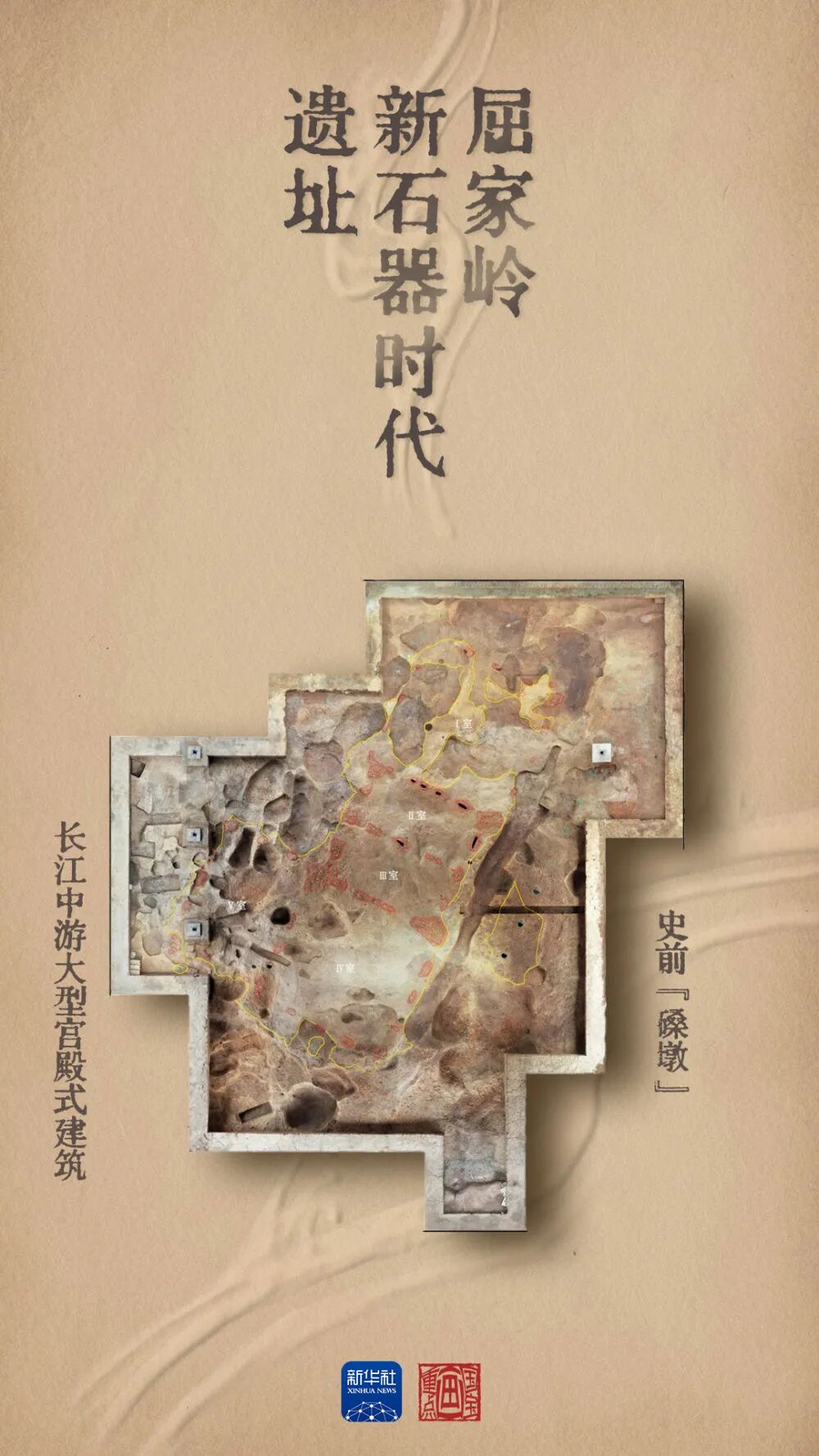 屈家岭新石器时代遗址,“屈家岭文化是长江中游最兴盛、最强势的一支新石器时代考古学文化”。屈家岭遗址考古项目负责人陶洋介绍,经过近 2 年考古发掘,遗址中心区域逐渐揭露一座面积约 510 平方米的大型建筑 F38“埋藏”着众多规模庞大、建造工艺考究的磉墩,用红烧土混合黏土及零星猪骨填满深坑。在 5 间“房子”内,近 70 个磉墩个个醒目,体量最大的长度超过 2 米、宽度超过 1 米,推测为一处宫殿式建筑。高等级建筑的出现意味着社会的进一步发展,建筑技术进步、建筑体量增大,勾勒出江汉平原史前文化和社会高度发展的生动图景。