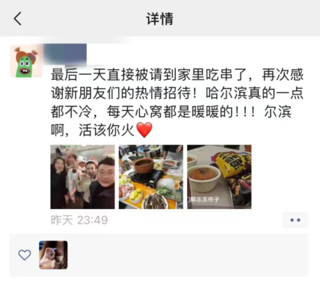 当天,小黄发了一条朋友圈:“哈尔滨真的一点也不冷每天都是暖的尔滨,活该你火!”