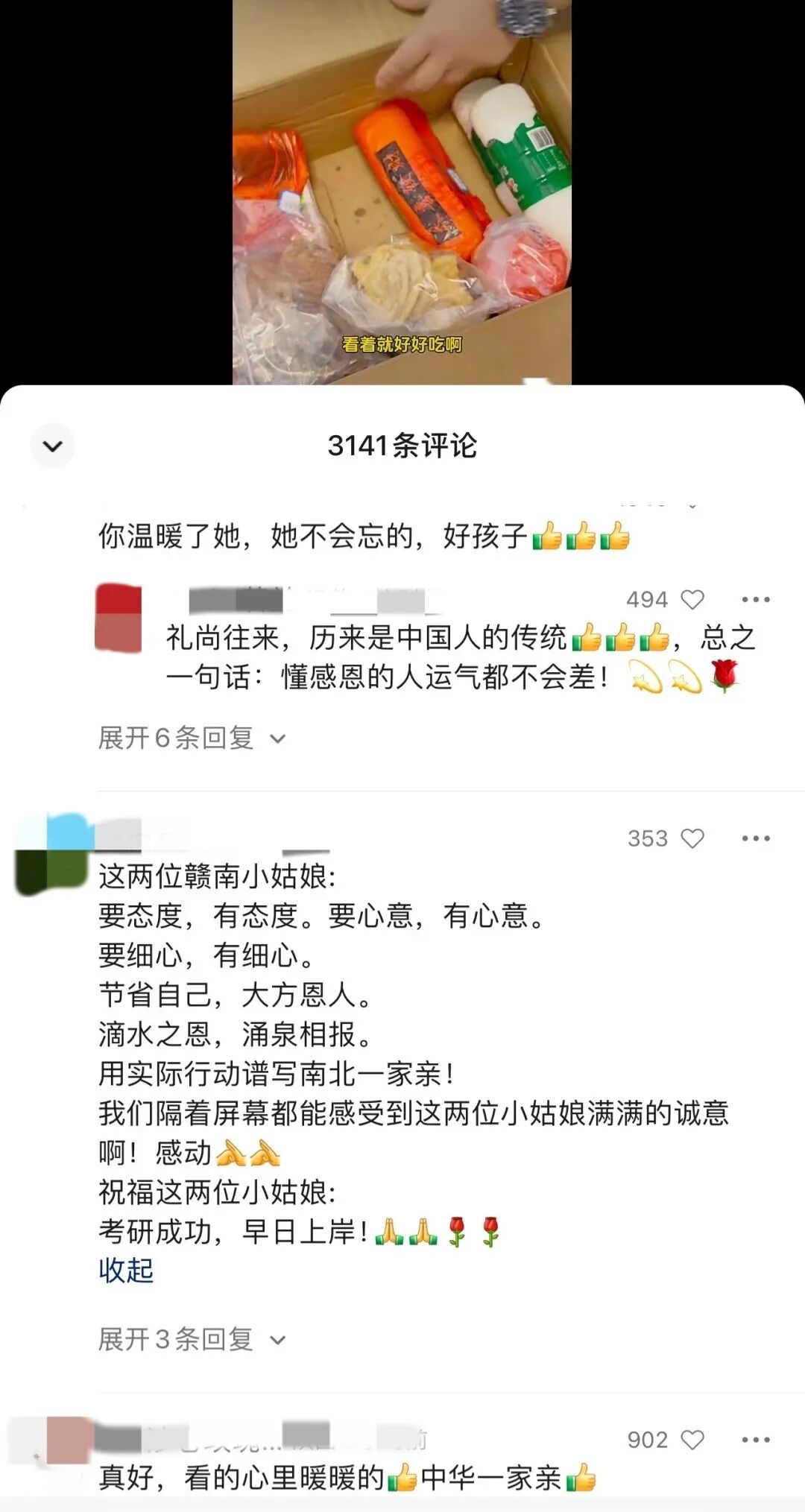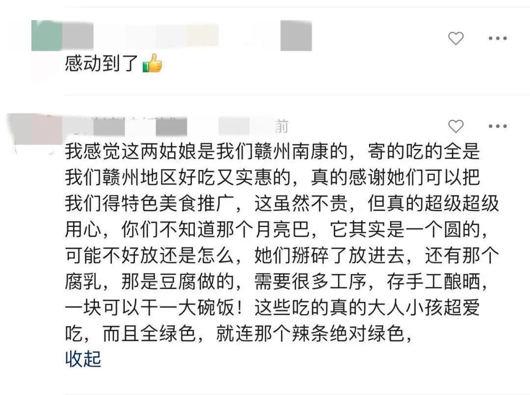 “节省自己、大方恩人用实际行动谱写南北一家亲”“她们这是集齐了江西18个县的著名特产给你寄过去了!”