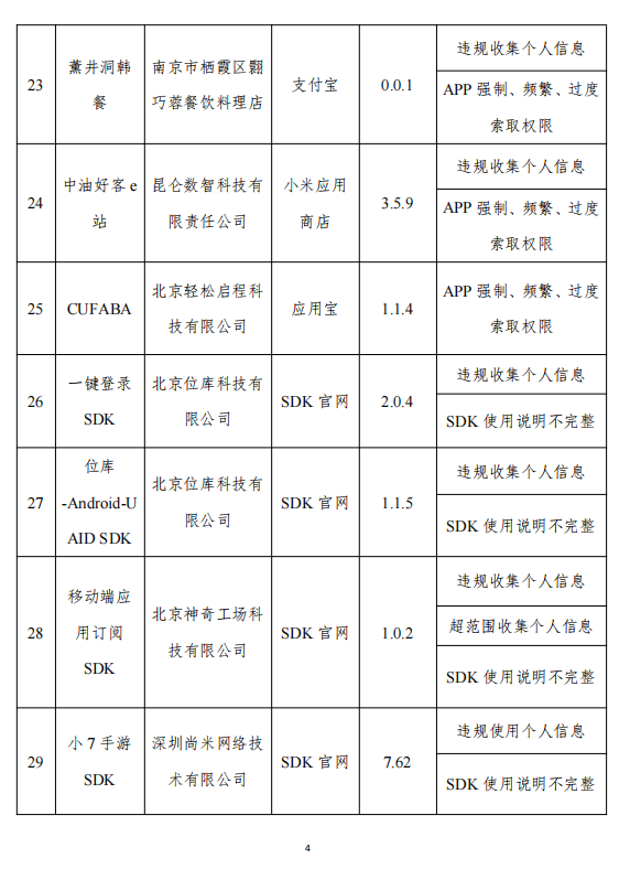 除违规APP外,工信部此次也公布了6款违规SDK,分别为北京位库科技有限公司旗下的一键登录SDK、位库-Android-UAIDSDK,北京神奇工场科技有限公司旗下的移动端应用订阅SDK,深圳尚米网络技术有限公司旗下的小7手游SDK,北京金域互动科技有限公司旗下的AppicAdSDK以及北京顶象技术有限公司旗下的顶象无感验证SDK。