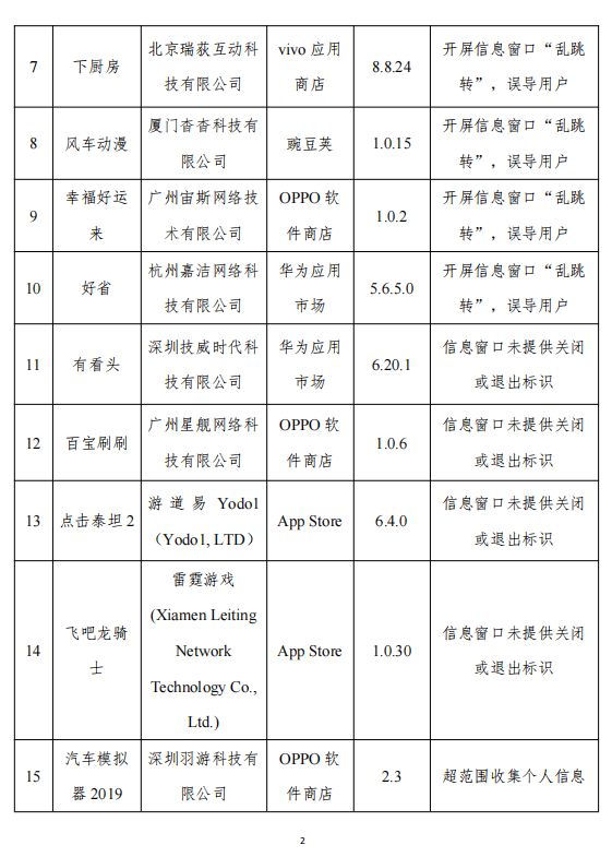 在这份通报名单中,闲鱼、高德地图、下厨房、秀动等10款APP存在开屏弹窗“乱跳转”的情况。有看头、百宝刷刷、点击泰坦2和飞吧龙骑士,这4款APP被通报“信息窗口未提供关闭或退出标识”。