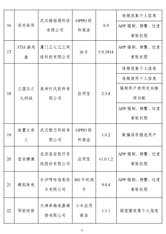 记者注意到,有多款游戏产品出现在违规名单中,如汽车模拟器 2019、保定麻将、3733游戏盒等,涉及欺骗误导强迫用户等。其中,泉州竹风软件有限公司出品的“三国志之九州战”游戏APP涉及违规收集、使用个人信息、强制用户使用定向推送功能以及APP强制、频繁、过度索取权限。
