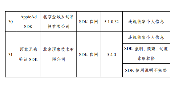 其中,移动端应用订阅SDK以及顶象无感验证SDK均涉及违规收集个人信息,SDK强制、频繁、过度索取权限以及SDK使用说明不完整三项问题。
