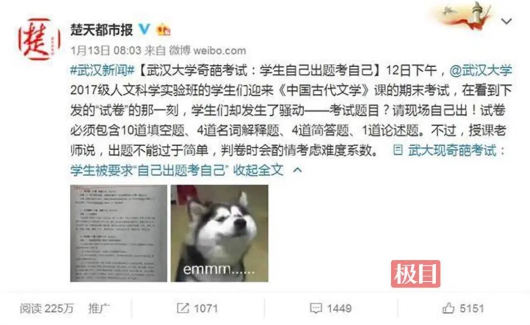 “之前从没碰到过这样的题,简直是期末考试的一股‘清流’。”武大新闻与传播学院大一学生苏丹阳说,读完试卷第一想法是题目很有创意,很有趣,且贴近生活。她认为,这样的题,只要对中国古代文学有一定涉猎就不至于无从下笔,所以难度不算大。