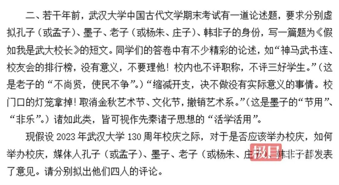 第二题属于“武大专享”——假设2023年武汉大学130周年校庆之际,对于是否应该举办校庆,如何举办校庆,媒体人孔子(或孟子)、墨子、老子(或杨朱、庄子)、韩非子都发表了意见,请分别拟出他们四人的评论。
