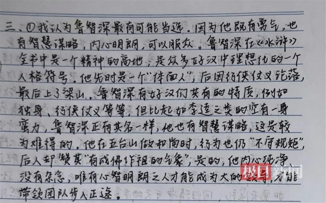 答卷中出现频率较高的包括林冲和吴用,主要是认为林冲武力高强,地位稳固,为人沉稳,而吴用足智多谋,也许能给梁山好汉带来更好的结果。还有一名同学表示,虽然最终当选的会是卢俊义,但他会投给“花和尚”鲁智深,并洋洋洒洒写下近千字文章阐述自己的理由。该同学认为,鲁智深粗鲁的外表下有着细腻的内核,是一个有勇有谋的人,而且他“内心纯净、没有杂念,唯有心智明朗之人才能成为大的领导,才能带领团队步入正途”。