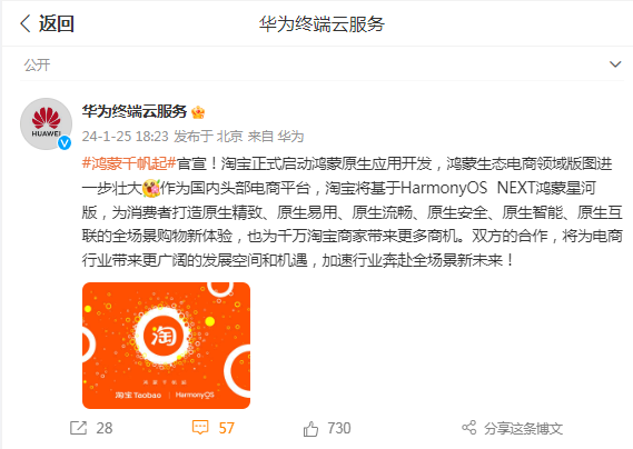 1月25日晚间,华为终端云服务微博发布消息称,淘宝正式启动鸿蒙原生应用开发。