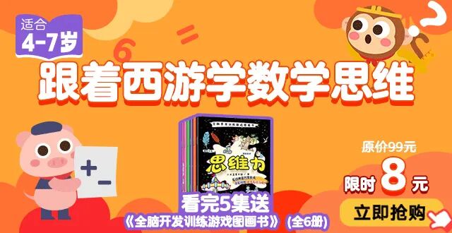 《跟着西游学数学思维》尝鲜版,仅需8元! 看完5集尝鲜视频,再送6册《全脑开发训练游戏图画书》,价值129元,包邮到家哦~
