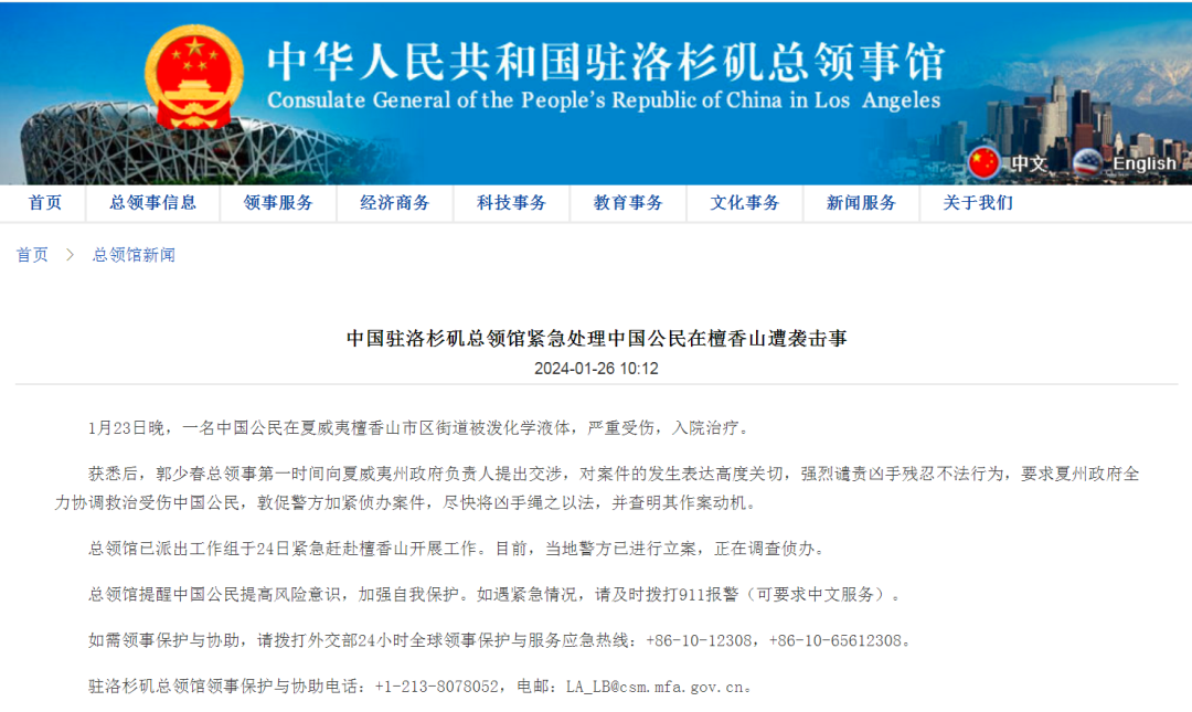 总领馆已派出工作组于24日紧急赶赴檀香山开展工作。目前,当地警方已进行立案,正在调查侦办。
