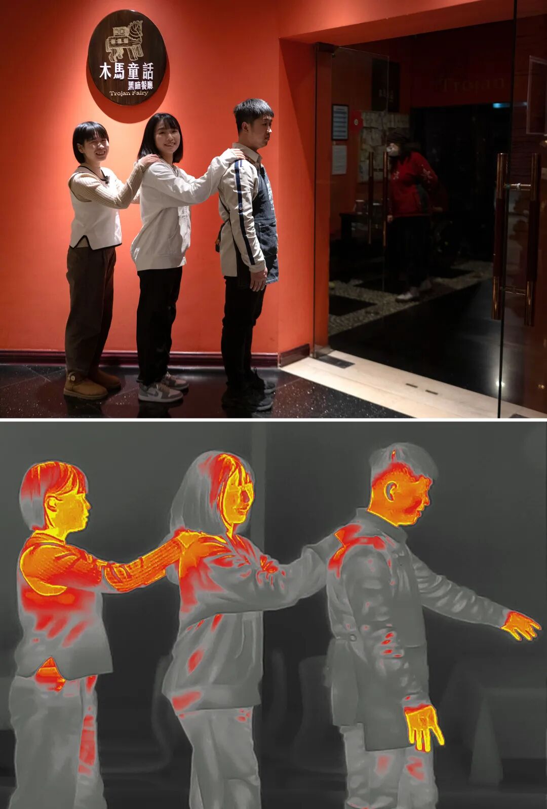 在全黑的环境中,就餐者尝试接触手指(热成像摄影)。