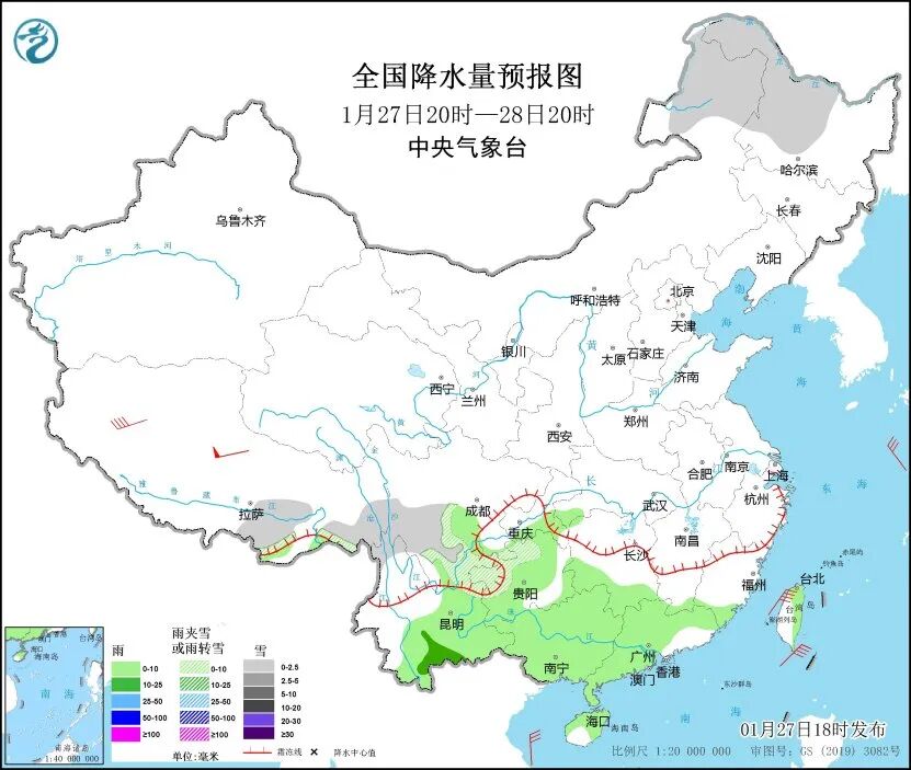 中央气象台预计,27日20时至28日20时,内蒙古东北部、黑龙江中西部、西藏南部、四川南部、贵州西部、云南东北部等地部分地区有小雪或雨夹雪。四川盆地南部、重庆东部、贵州中部、云南中东部、广西、湖南南部、广东大部、福建南部、海南岛、台湾岛等地部分地区有小雨,局地中雨。