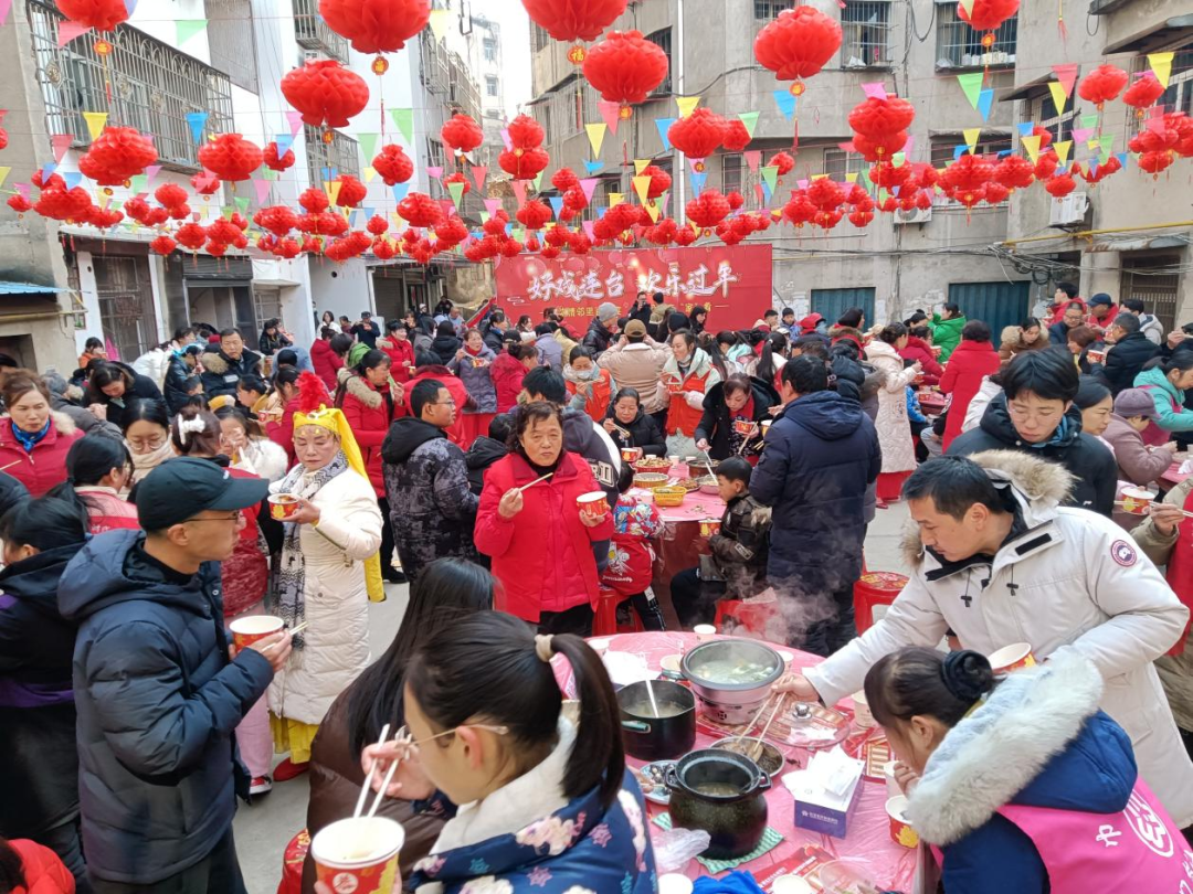 “开席了,开席了!”150余户居民欢聚一堂,各自带着自家的拿手菜,10人一桌围席而坐,鸡、鱼、牛、羊肉、精美糕点等各式菜肴品种丰富,色香味俱全。“这红烧肉做得真好吃,我得跟你好好学学。”“来,尝尝这碗汤,我可是炖了一上午,提点意见……”居民们一边吃着自发烹制的菜肴,一边共话美好生活。