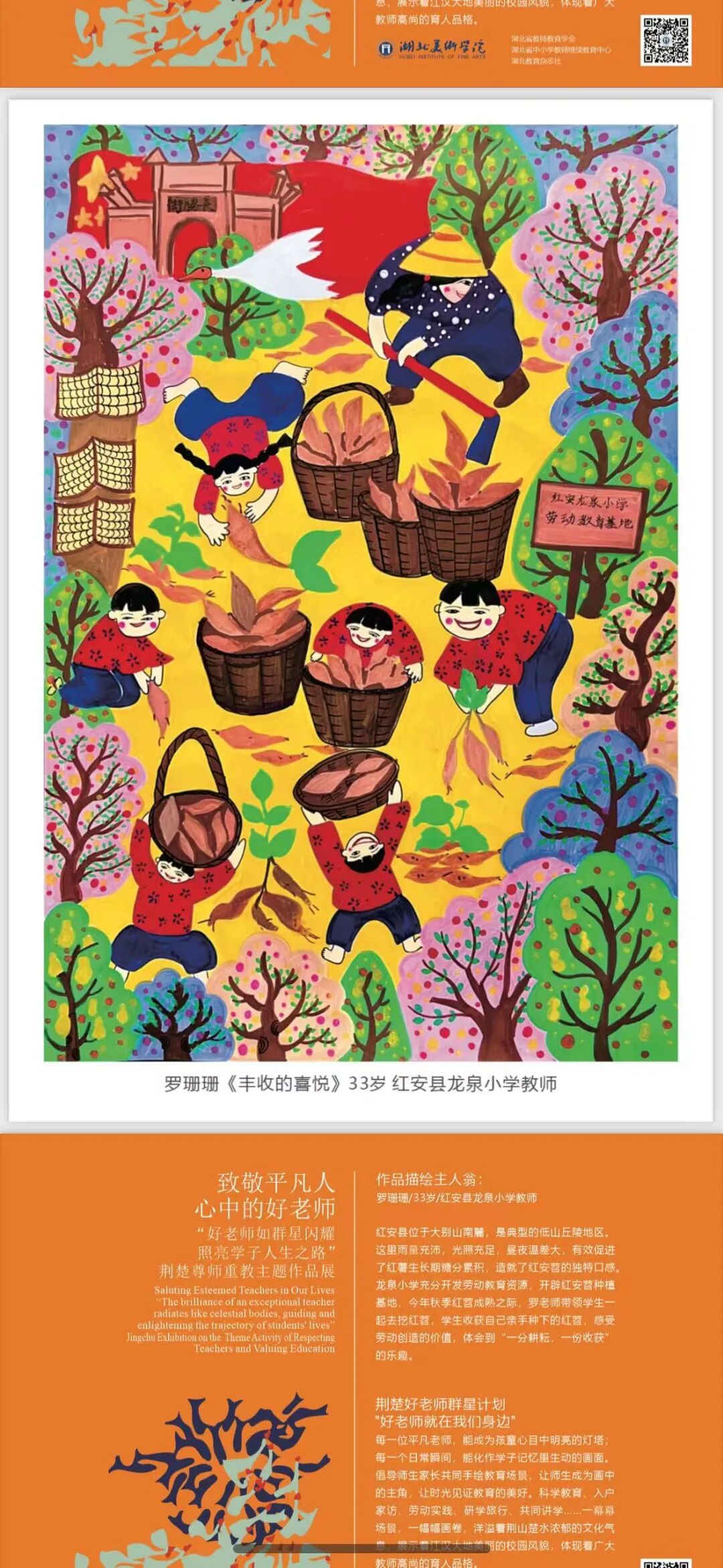 据悉,2023年度湖北省“尊师重教”叙事主题美术作品征集活动,由省教育厅组织,湖北美术学院承办,共有103个县、129所学校参与,红安县教育局报送艺术名师工作室10幅教师作品。经省专家组初步评定,黄冈市目前共有三幅作品进入评委视线,罗珊珊、徐萌两位老师的美术作品,通过层层选拔,双双入围“致敬平凡人心中的好老师”荆楚尊师重教主题作品展,其他作品正在陆续评定中。