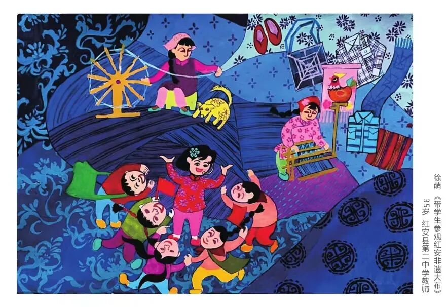 两位教师通过描绘红安县中小学生参加劳动实践教育和参观非物质文化遗产制作技艺的生动场景,以饱满的创作构图和鲜艳明快的色彩语言,展现了近年来我县青年教师培养成果,实现了省级美术作品创作展览新突破。