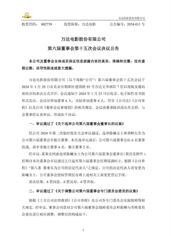 29日,万达电影公告,选举陈曦女士(艺名:陈祉希)任万达电影董事长兼总裁。