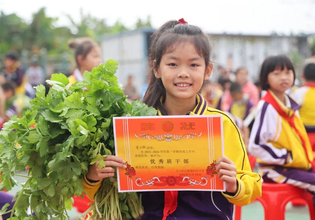 果蔬虽小,承载的心愿却很大。“芹菜寓意着勤劳肯干,甘蔗寓意着节节高。”白石小学校长李杨介绍,每一份奖品都凝聚了学校老师对孩子们的新年祝福,能让学生感觉到自己的努力被肯定,让他们体会到努力的结果是甜的。