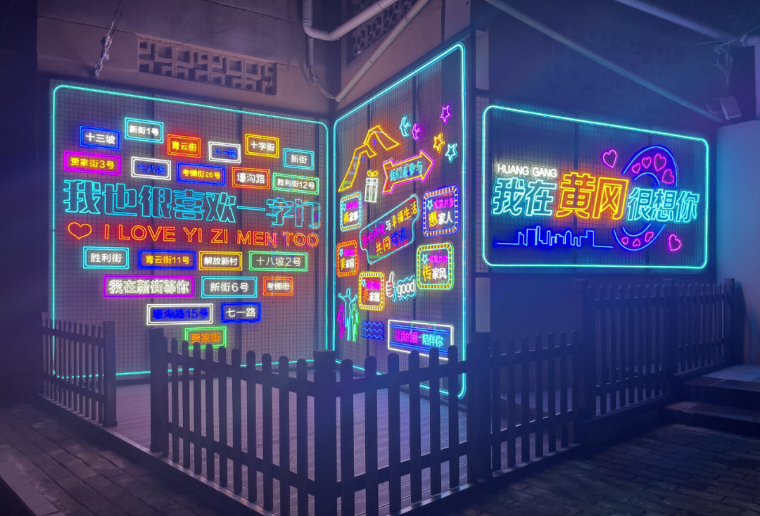 夜幕降临,一字门社区的“网红墙”上的霓虹灯亮起,给老街增添了不一样的潮流气息,格外引人注目。