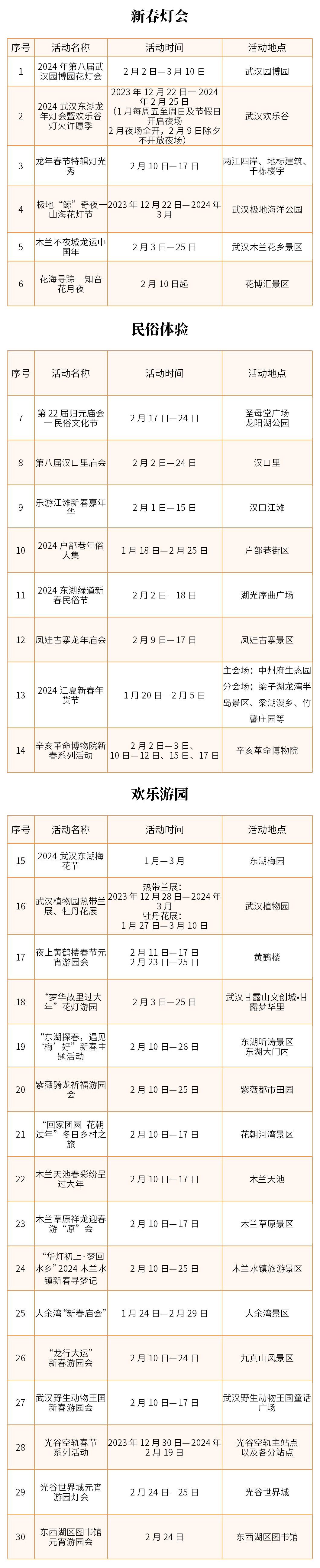 春节期间,武汉持续发放文旅惠民福利。2024年2月7日-2月25日,武汉市东湖风景区还将开展2024年“我们的节日——东湖龙年新春文旅惠民系列活动”,面向市民游客免费发放10万张文旅惠民券,可预约景区及项目有东湖龙年灯会(武汉欢乐谷夜场)、东湖梅园、落雁景区、武汉植物园、东湖之眼摩天轮等。
