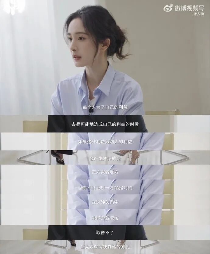 杨幂回应称:“江湖传闻有这么多,很多东西是我不了解的,我也不知道传闻传成这样是为什么。每个人为了自己的利益,去尽可能地达成自己利益的时候,如果这种利益跟别人的利益会产生冲突的话,大家自然而然成了正方或者反方,但你不能说哪一方是对的。那我觉得,在这种关系中能取舍就取舍,上过班的都懂,能沟通就沟通,沟通不了就算了,都是有取舍的。”
