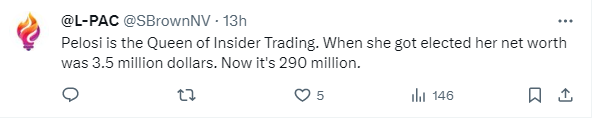 还有人说:“佩洛西是内幕交易女王。刚当选时,她的净资产是350万美元。现在是2.9亿。”(注:美国纳斯达克网站2023年10月24日的数据称,佩洛西与丈夫的身家大约为1.2亿美元)