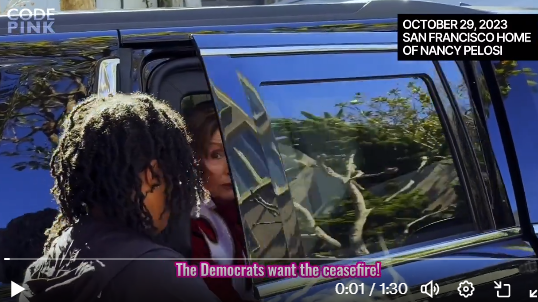 在此情况下,美国反战组织“粉色代码”(Code Pink)于1月30日在社交媒体X上发布了一段显示发生于去年10月29日的视频。视频显示,一群反战抗议者堵住佩洛西乘坐的汽车,佩洛西竟对他们说“回中国去,那里是你们的大本营”。