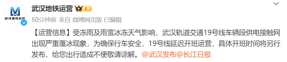 武汉轨道交通19号线延迟开班运营▼【运营信息】受冻雨及雨雪冰冻天气影响,武汉轨道交通19号线车辆段供电接触网出现严重覆冰现象,为确保行车安全,19号线延迟开班运营,具体开班时间将另行发布,给您出行造成不便敬请谅解。