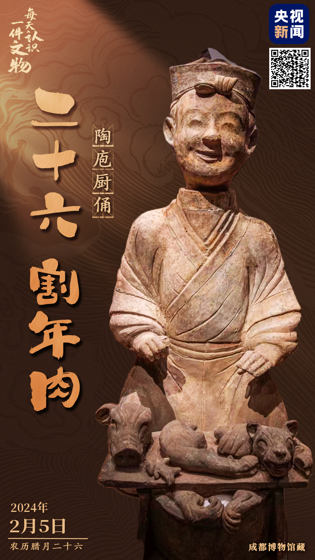 腊月二十六,割年肉。这位“大师傅”,身着汉代特色的右衽袍服,头上戴着介帻(jiè zé),正跪坐在地上,脸上还挂着喜气洋洋的笑容。它是四川地区汉代陶俑的重要类型,也是汉代“天府之国”富足安定的真实写照。