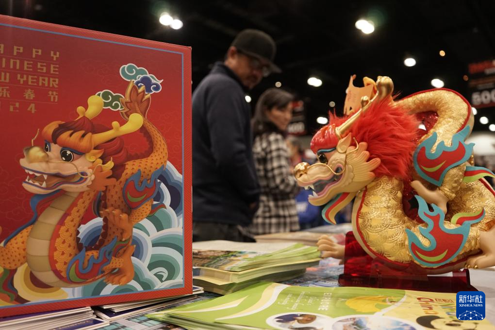 这是2月3日在美国洛杉矶举行的2024年洛杉矶旅游探险展中国旅游展位上拍摄的“欢乐春节”吉祥物“吉祥龙”。 2024年洛杉矶旅游探险展3日在洛杉矶开幕,中国旅游展商成为展会最大亮点之一。 新华社发(曾慧摄)