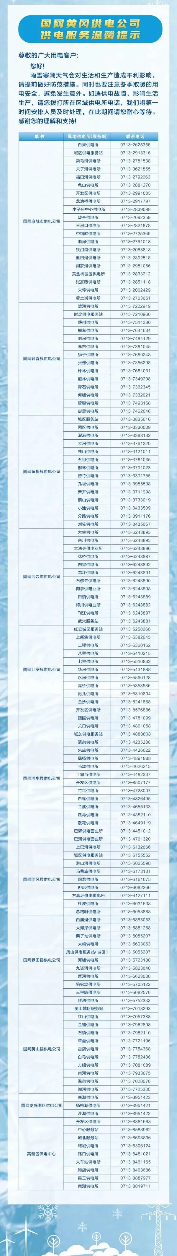 寒潮来袭,为保证用户正常用电,国网黄冈供电公司公布了各供电区域的24小时服务热线↓