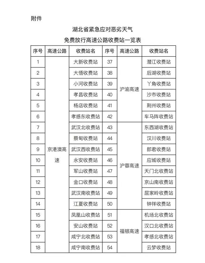 2月5日晚,记者从湖北省交通运输厅获悉,针对近日湖北省境内部分高速公路路段因恶劣天气造成车辆拥堵严重的情况,结合最新天气预报及路网运行情况,经湖北省人民政府和交通运输部同意,调整免费放行收费站所及时间区间,自2024年2月5日20:00至6日12:00,对在指定收费站驶出高速公路的所有车辆实施免费放行。