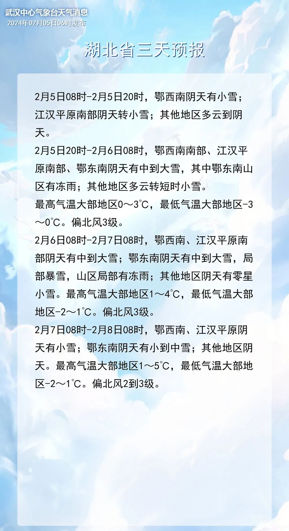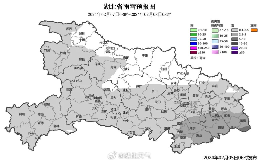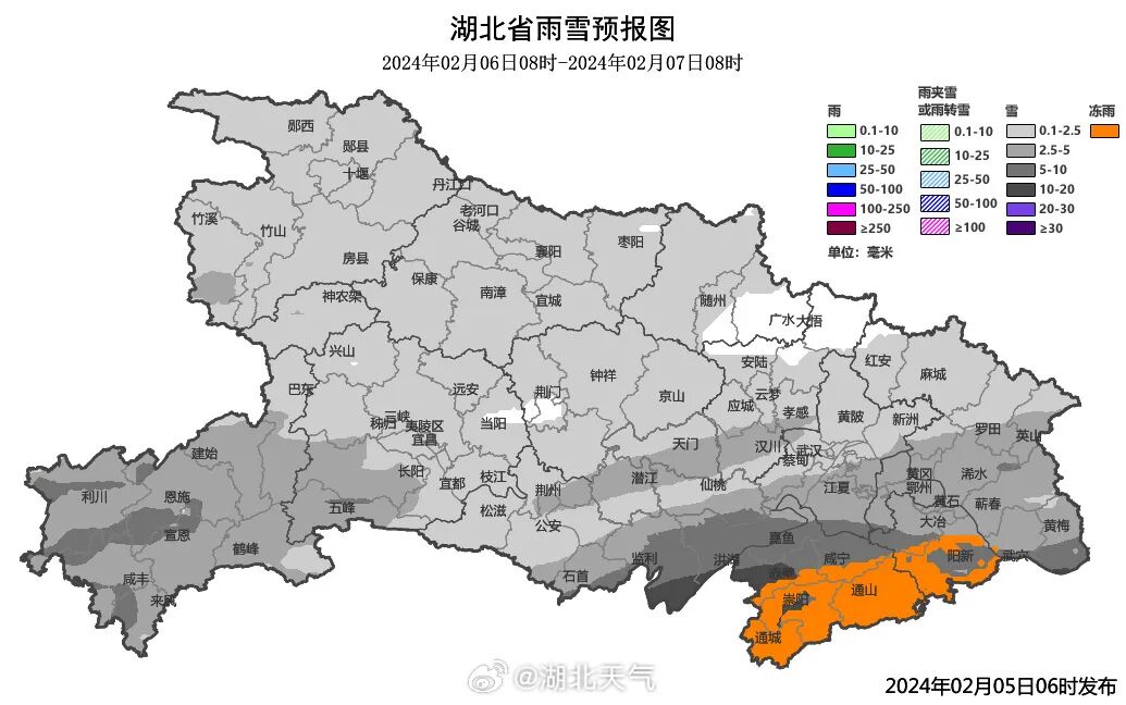 2月6日:南部中到大雪,鄂东南局部暴雪,其中鄂东南山区有冻雨,北部短时小雪。
