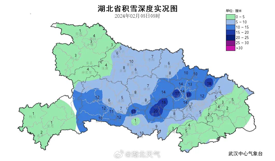 截至今天05时,湖北大部地区积雪深度 1至20厘米(潜江),其中21县(市、区)超过10厘米,有25县(市、区)出现电线积冰。雨雪影响下,昨日全省最高气温仅-2~3℃,今晨最低气温-9~-1℃、山区局部-11 ℃。