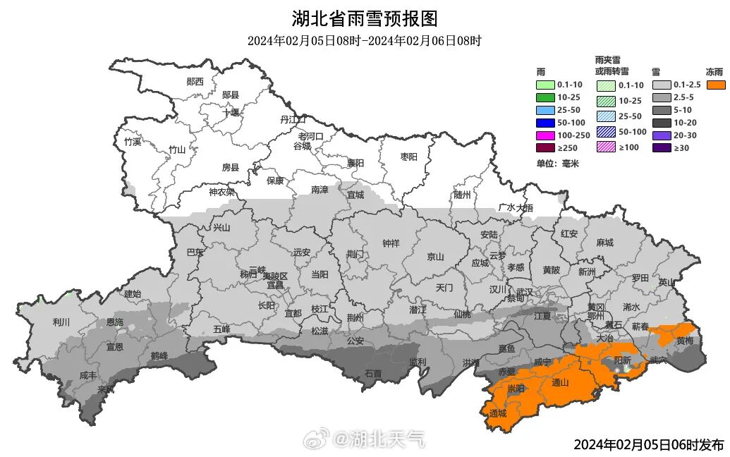 2月5日夜间:南部中到大雪,其中鄂东南山区有冻雨,北部短时小雪。