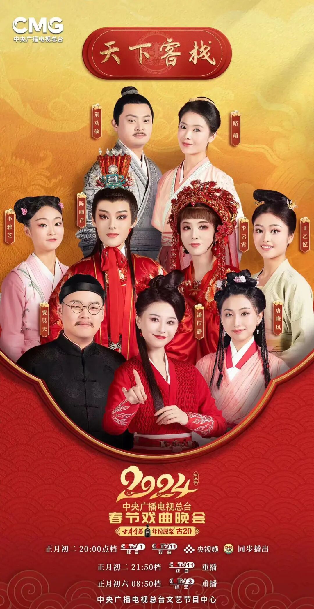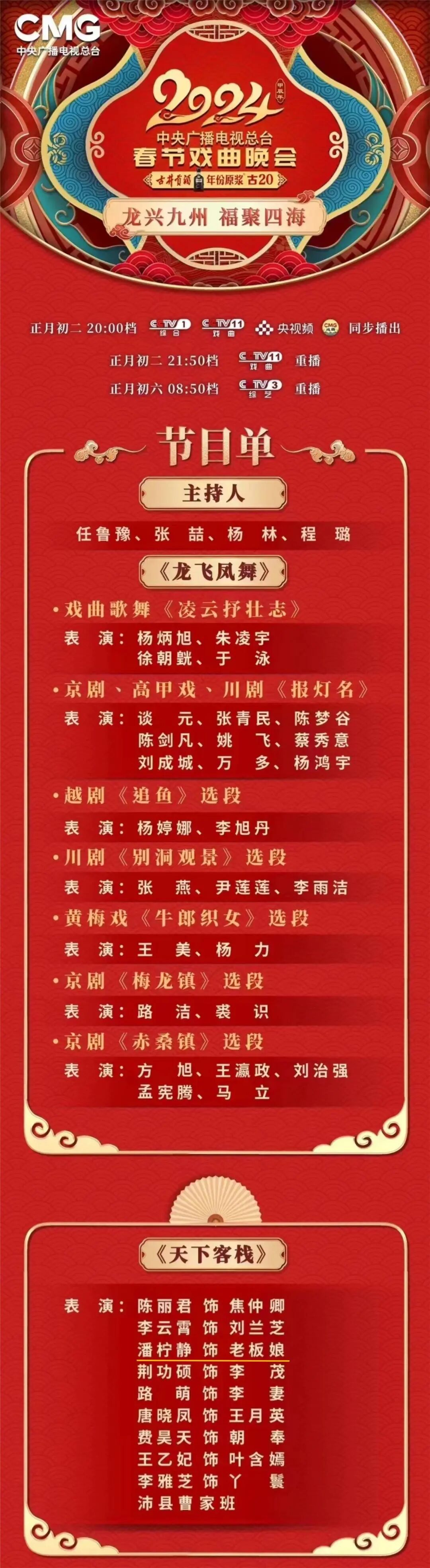 《2024年春节戏曲晚会》2月11日(正月初二)晚八点档在央视综合频道(CCTV-1)和戏曲频道(CCTV-11)并机首播,央视频、央视网、央视文艺等平台同步上线。