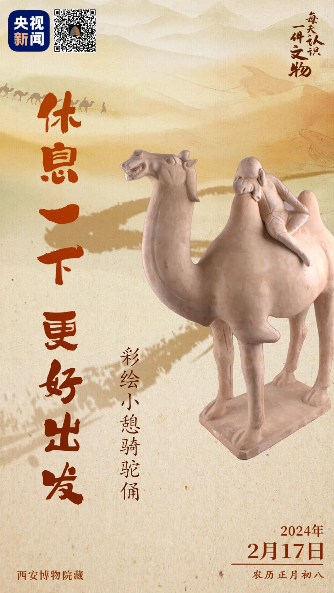 彩绘小憩骑驼俑,收藏于西安博物院,定格了丝路上的可爱瞬间:女孩横骑在驼背上,右手搭在驼峰,头枕胳膊,侧身盘腿。骆驼曲颈昂首,张口嘶鸣,仿佛在说“别睡啦,到站啦!”