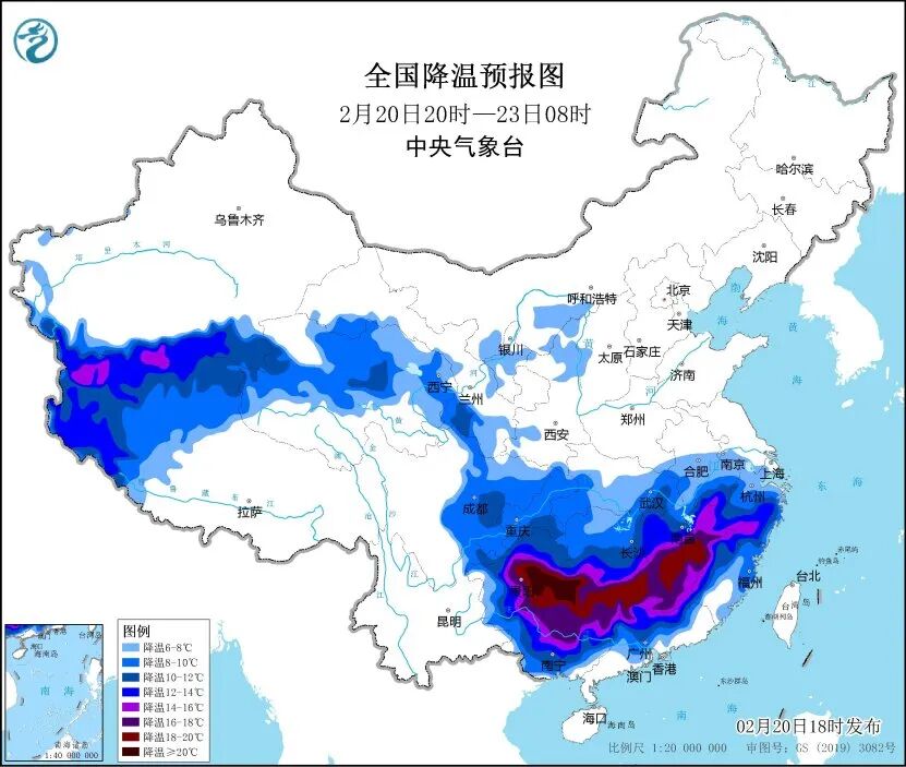 中央气象台20日18时继续发布寒潮橙色预警:受寒潮影响,预计20日20时至23日,我国南方大部地区将出现降温,日平均或最低气温普遍下降8~12℃,西南地区东南部、江南大部、华南中北部等地气温下降12~18℃,其中,贵州东南部、湖南西南部、广西北部等地的部分地区累计降温幅度可达20℃以上。