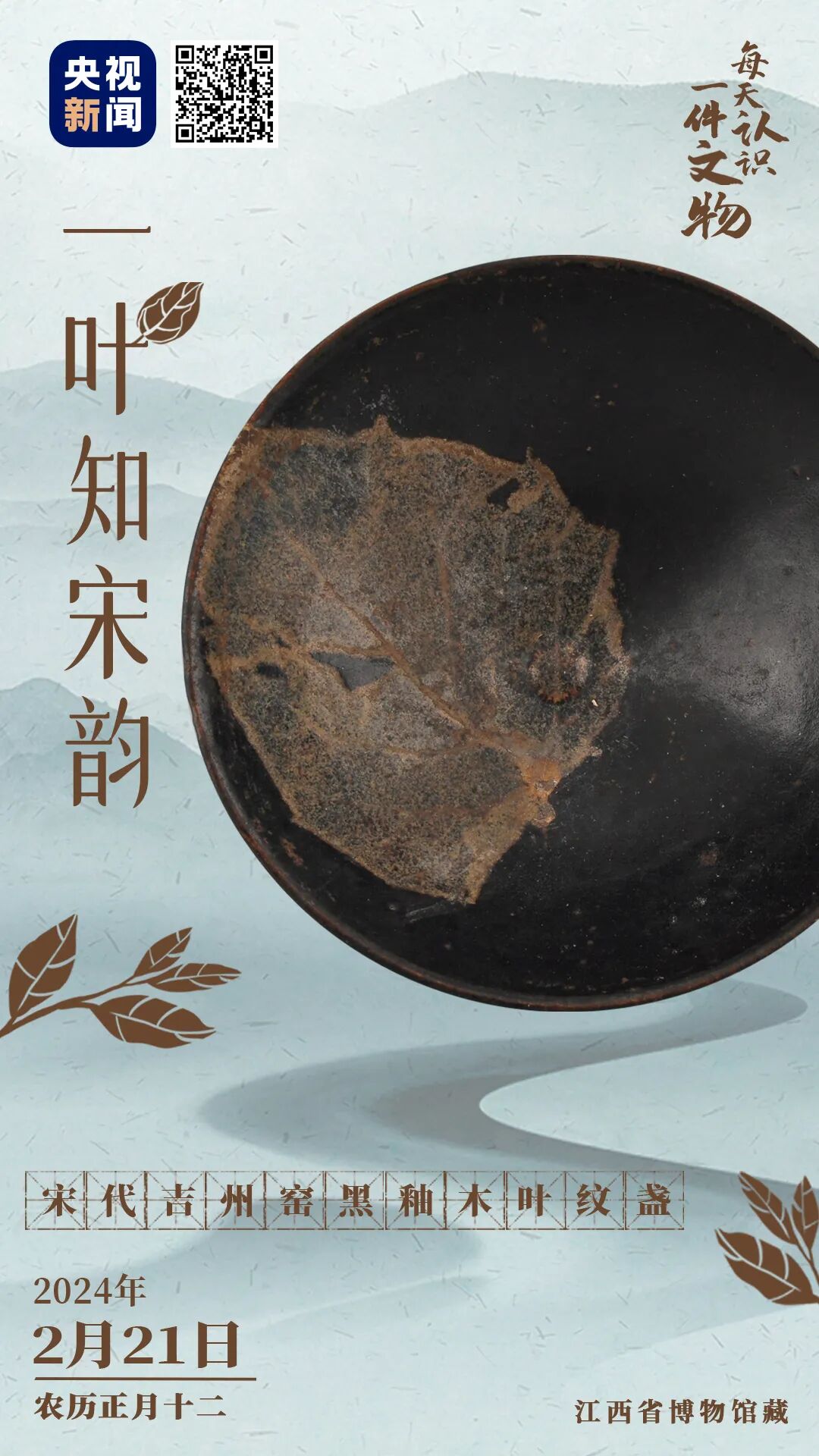宋代吉州窑黑釉木叶纹盏,现藏于江西省博物馆。盏内壁的叶子从中央向口沿展开,纹理惟妙惟肖。由于叶子烧制时易扭曲变形,想烧出完整叶子,全凭借天时、地利、人和,木叶纹盏由此收获“举世叶无双,盏盏皆唯一”的美名。