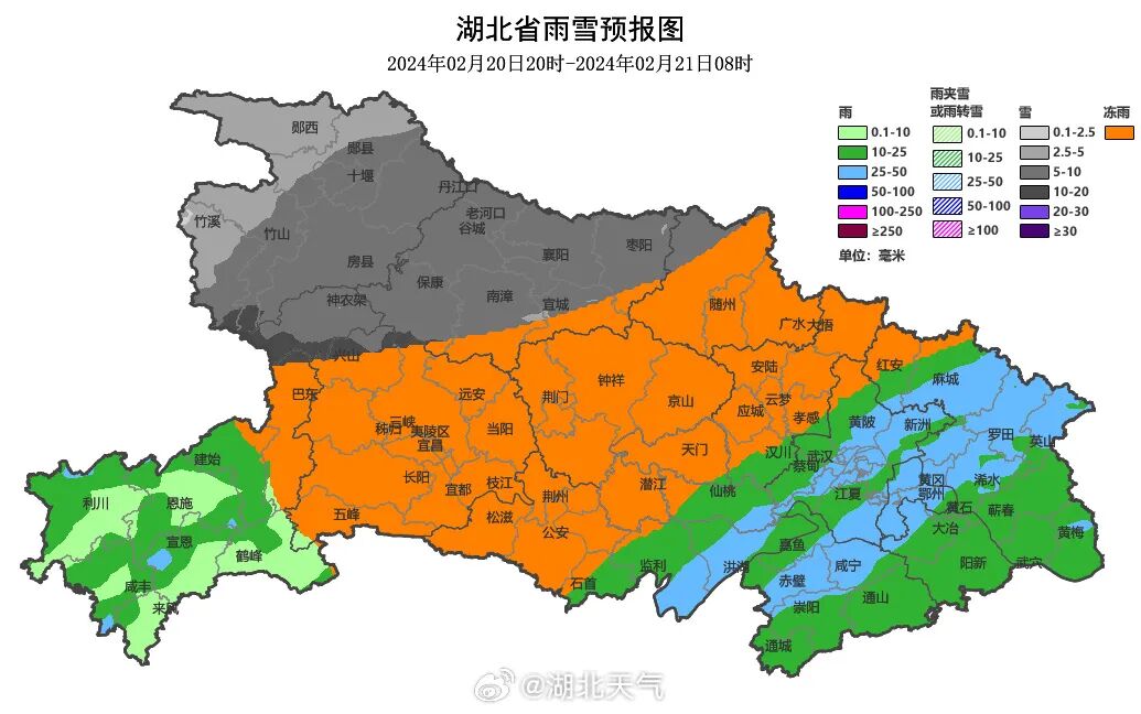 今晚(20日)8时至明早(21日)8时,十堰、襄阳、神农架、随州西部雨夹雪、冰粒或冻雨转中到大雪,局部暴雪;宜昌、恩施北部、荆门、随州东部、孝感、荆州西部、天门、潜江、武汉西部中雨转冻雨或冰粒;其他地区中到大雨,黄冈、武汉、鄂州、咸宁、黄石局部暴雨并伴有短时强降水、雷暴大风、冰雹等强对流天气。最高气温北部2-6℃、南部7-10℃,最低气温北部-4至0℃、南部1-5℃。偏北风4到6级、阵风7到10级。