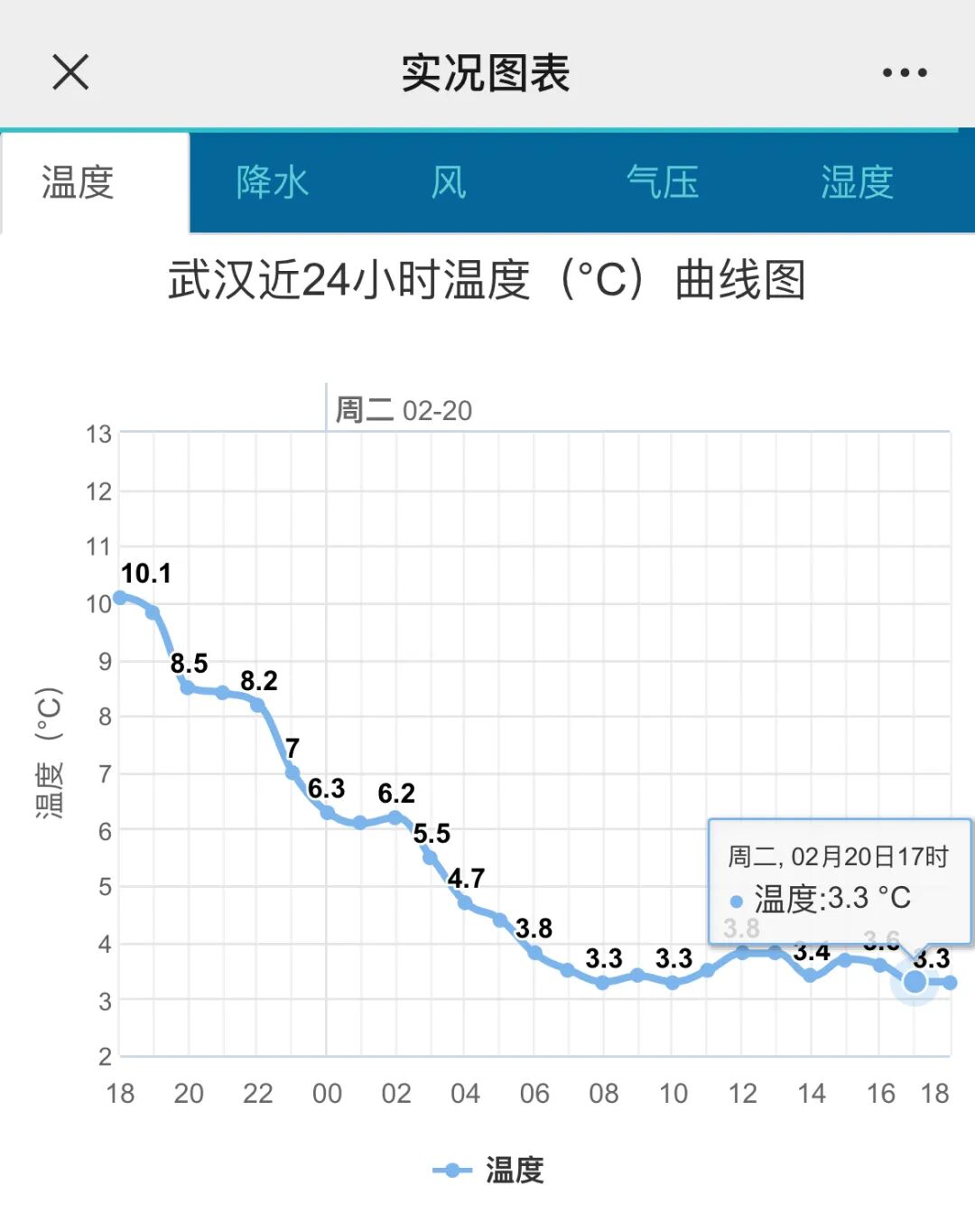 武汉气温直线下降,近三天17时气温分别为:18日26℃,19日11.1℃,20日3.3℃。