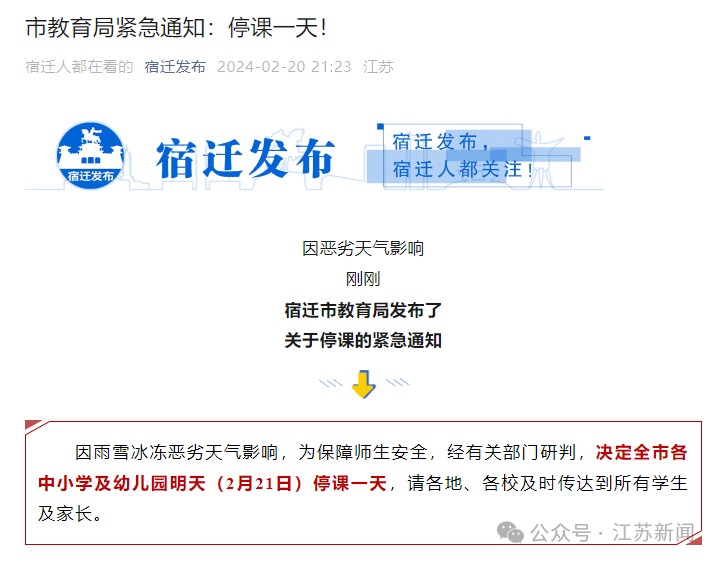 2月20日江苏宿迁发布紧急通知:2月21日全市各中小学及幼儿园停课一天↓↓↓